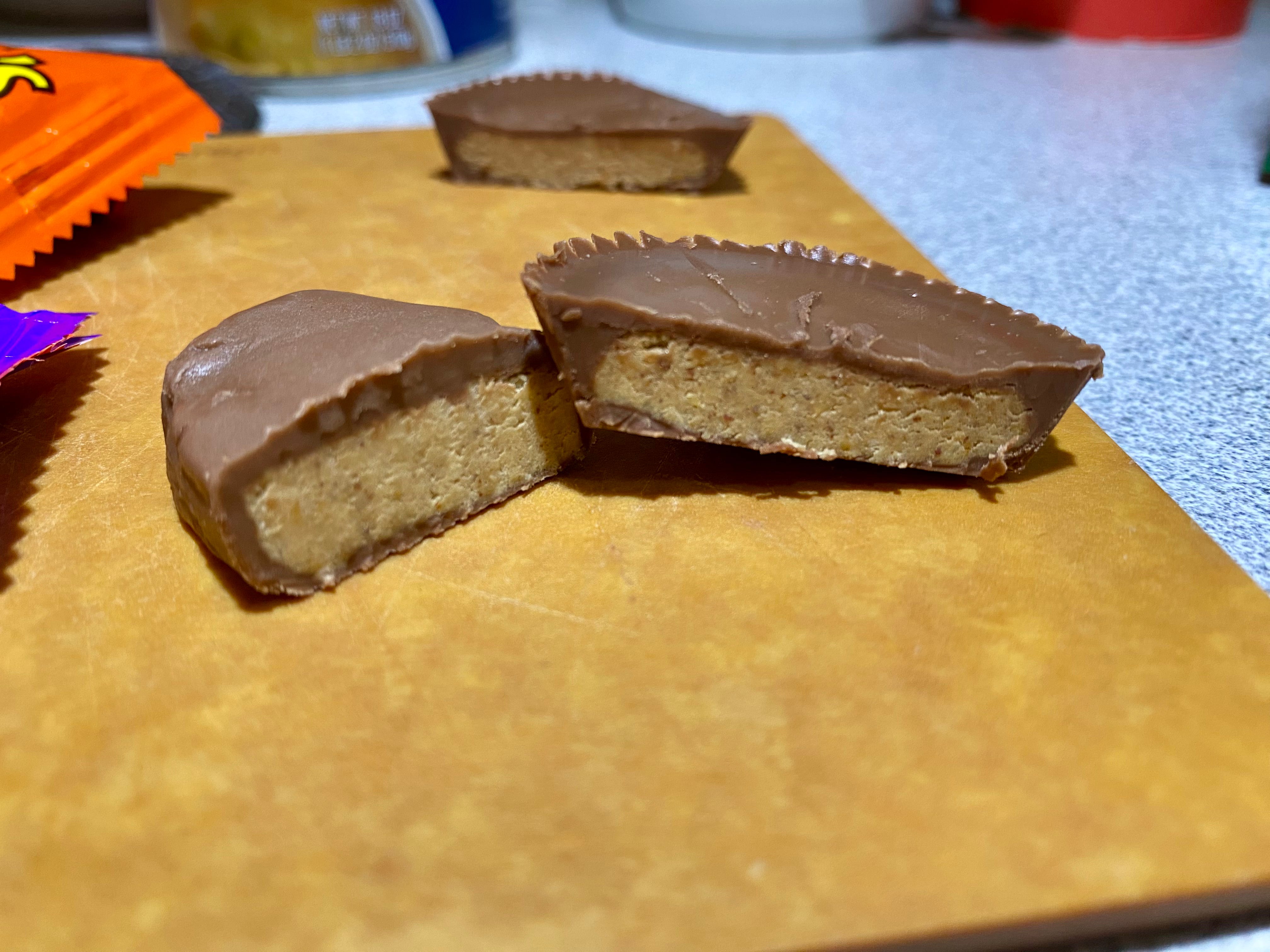 The textural difference was apparent as soon as I opened them. Both looked a little worse for wear, having experienced some light melting and smooshing during their journey from the factory to our kitchen counter. The traditional cup lost its signature smooth veneer, but the original patina was still visible, and the depths of the molten ridges and valleys illustrated how thick the chocolate is. Meanwhile, the pumpkin looked lumpy, the coating limply falling into the form beneath it like a tarpaulin in the rain. You could feel that the chocolate on the pumpkin was softer and flimsier.